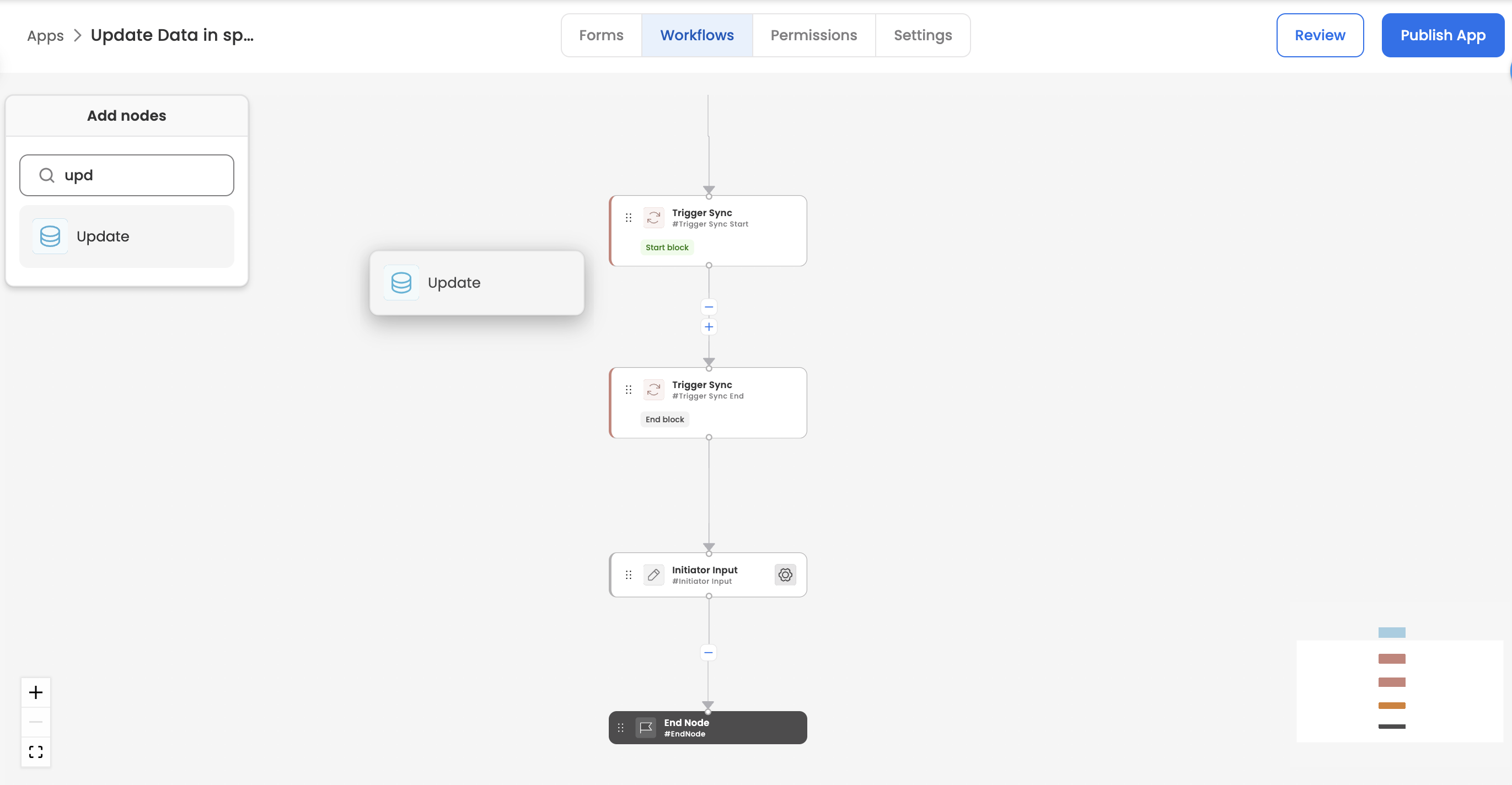 Add the Update Data node on the workflow canvas by either adding it within sync block or by dragging and dropping on the canvas.