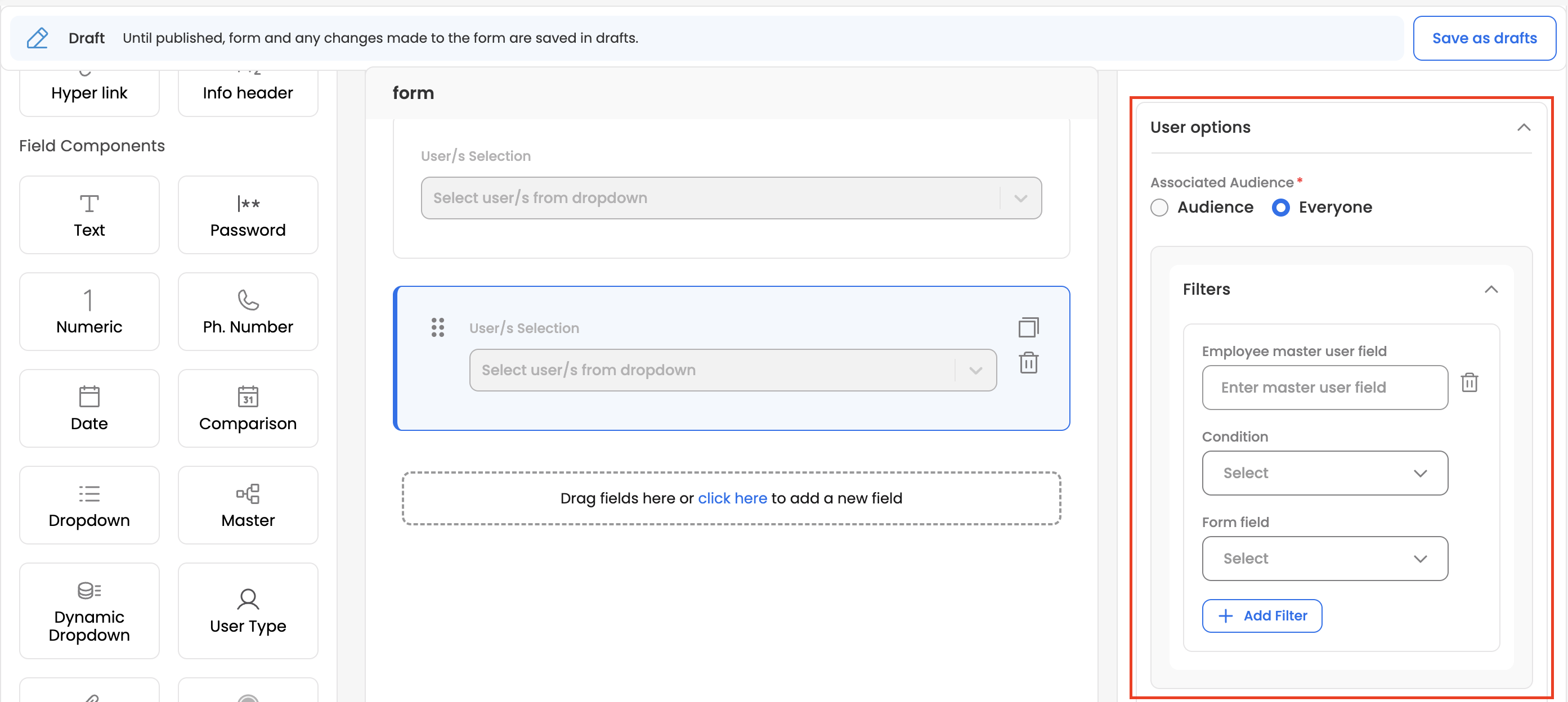 Form Field | Select the form field for the value to be compared with | In case no filter conditions match/are not true, no filter rules would be applicable, and all the users would get listed for the selected audience. |