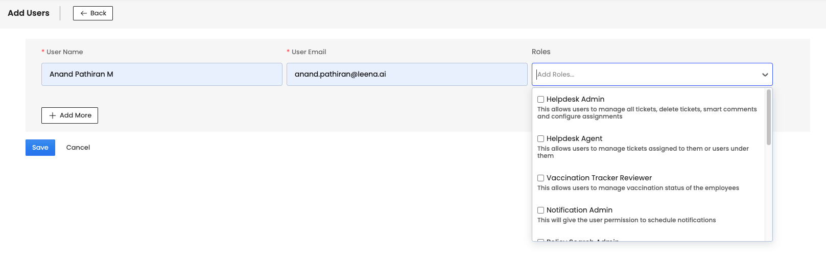 Different roles for each of the users can be defined from the dropdown. For Helpdesk dashboard access, we will have to choose helpdesk admin or helpdesk agent for the user.