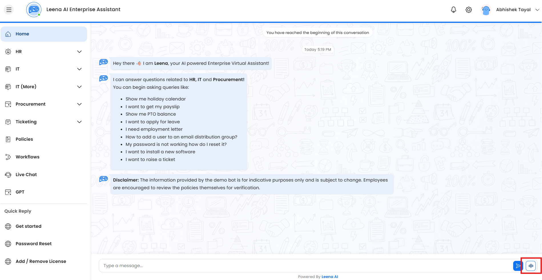 Locate the Icon: In the chat interface of the Leena AI web app, you will now see a new "Start Voice Call" icon beside the chat composer.