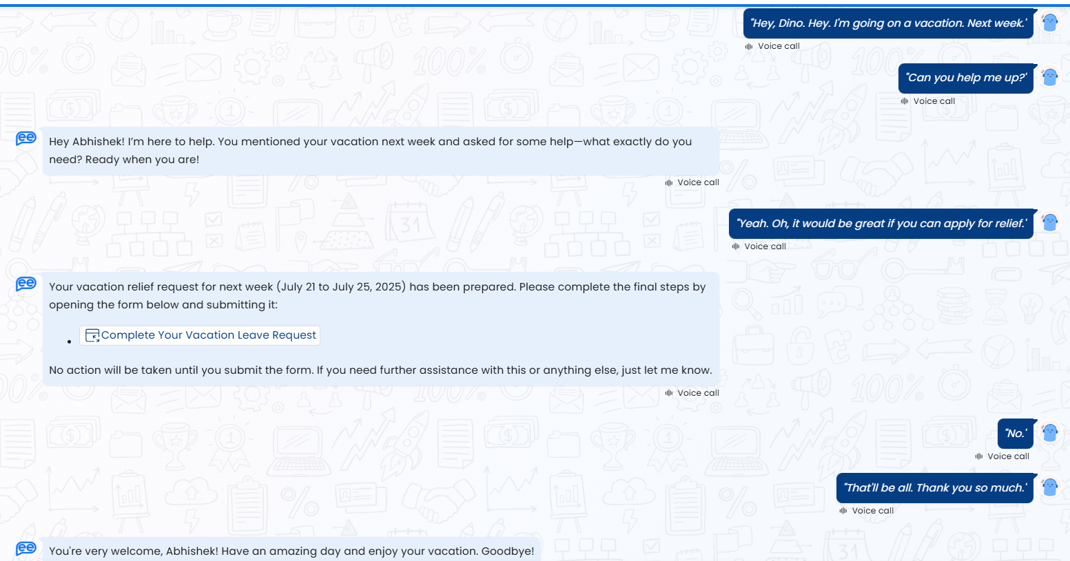 Beyond interacting with Leena AI agent via chat, users can additionally interact with the agent via a voice call which has all the capabilities available that are accessible on chat. This new voice call functionality is designed to provide a more natural, convenient, and accessible way to get the help you need, especially for complex requests and execute exterprise workflows.