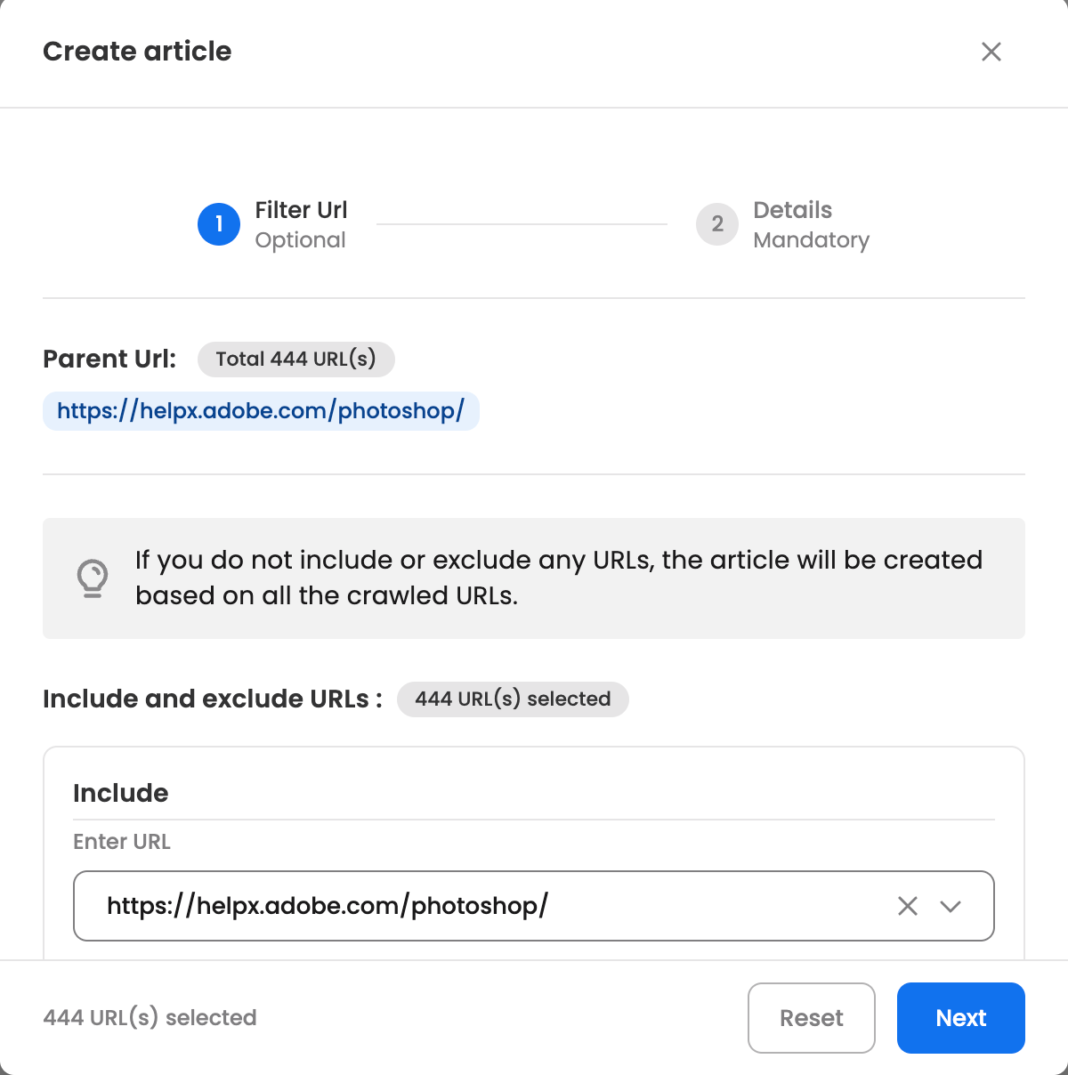 Apply Filters (Optional): Users can apply filters to include or exclude selected URLs for adding to the knowledge article.