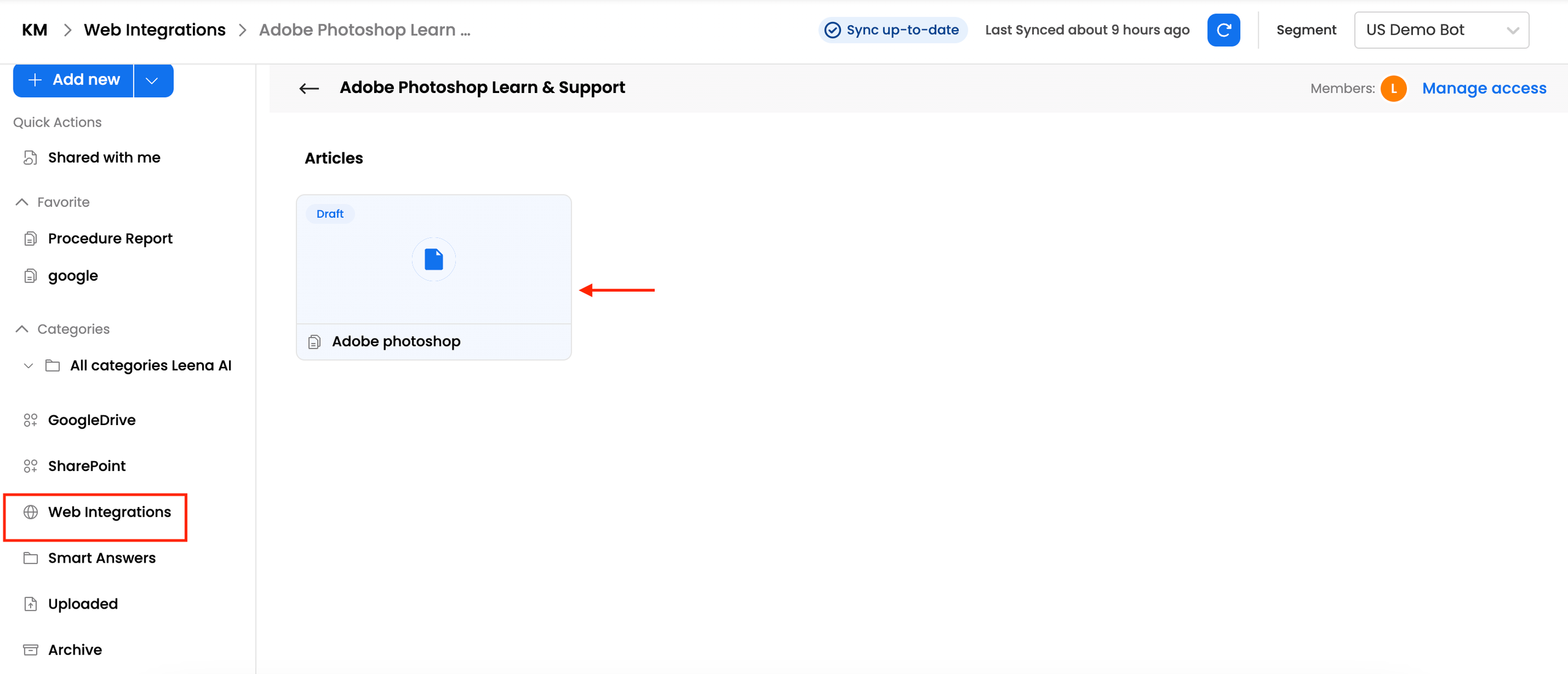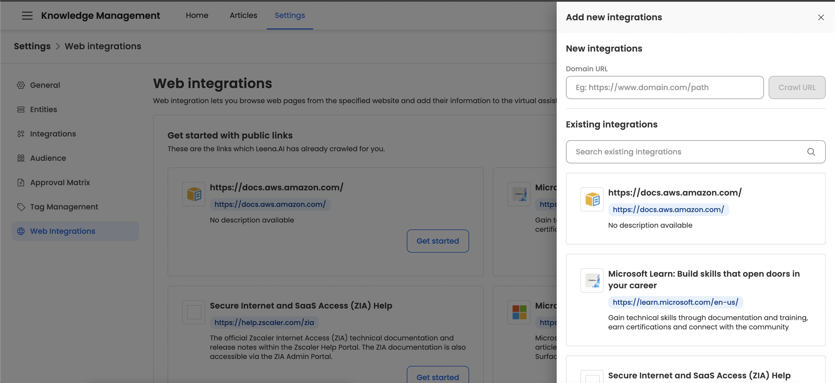 Q: What is the primary function of the Web Integration feature? A: It allows Leena AI to crawl and scrape data from public websites (like support sites or company websites) and integrate that information directly into the Knowledge Management (KM) base.