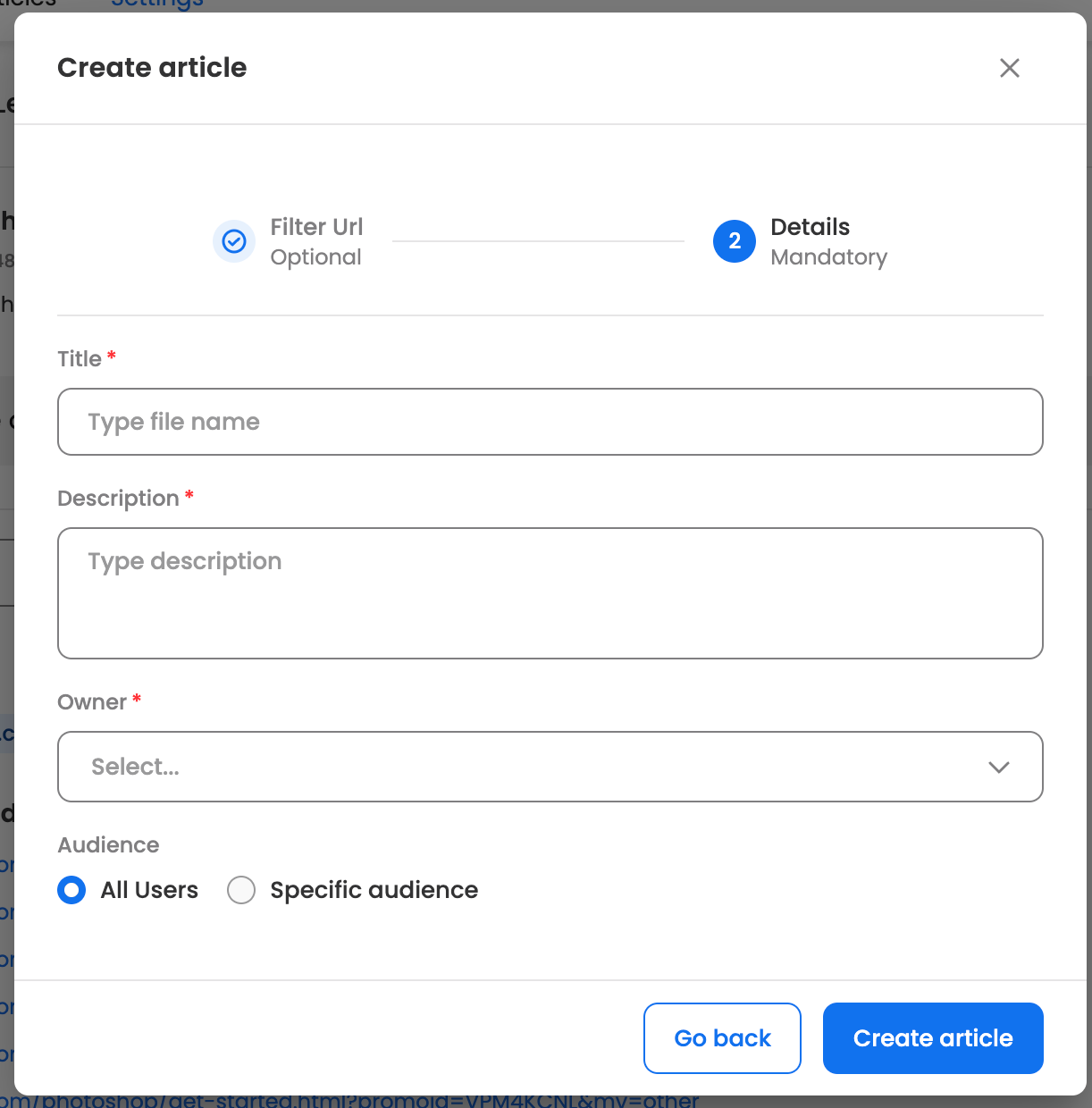 Article Details: After applying filters (if required), move to the next section, fill in the required article details, and create the article.