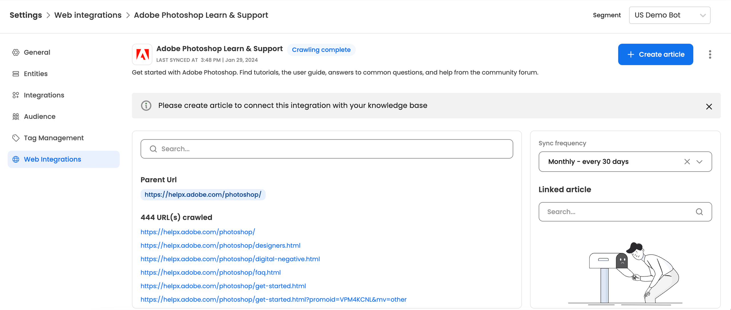 Once the crawling process is completed for a new web integration (or existing sample integrations), users have to create knowledge articles to integrate this knowledge with the virtual assistant.