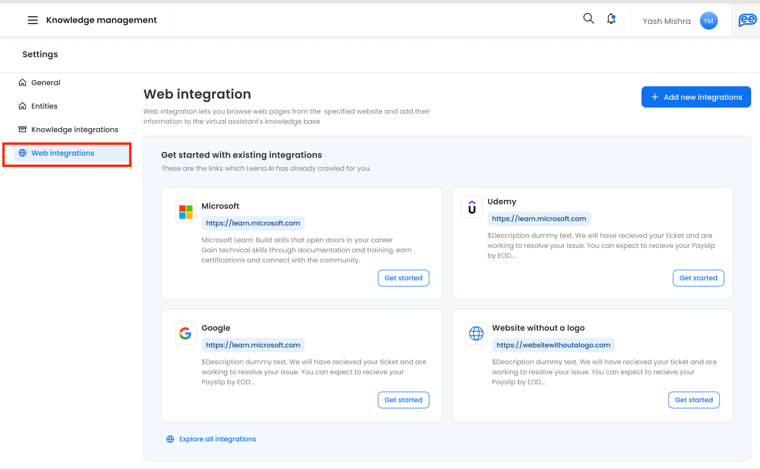 Here you can also see the global library of web integrations maintained by Leena AI under the “Existing integrations” section.