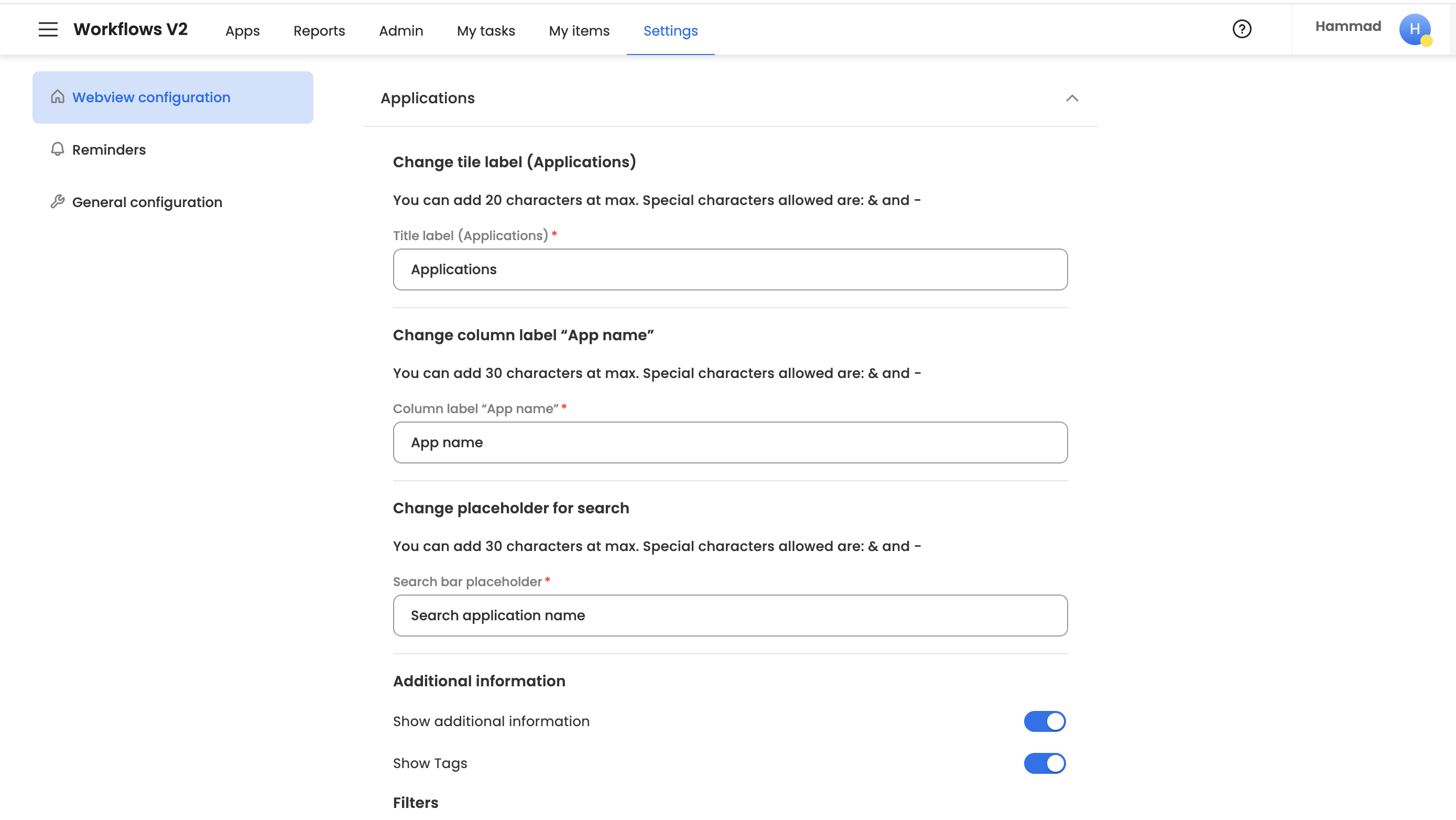 - It is required to make changes to the default workflows web-view & allow user to make label changes or show/hide additional information.