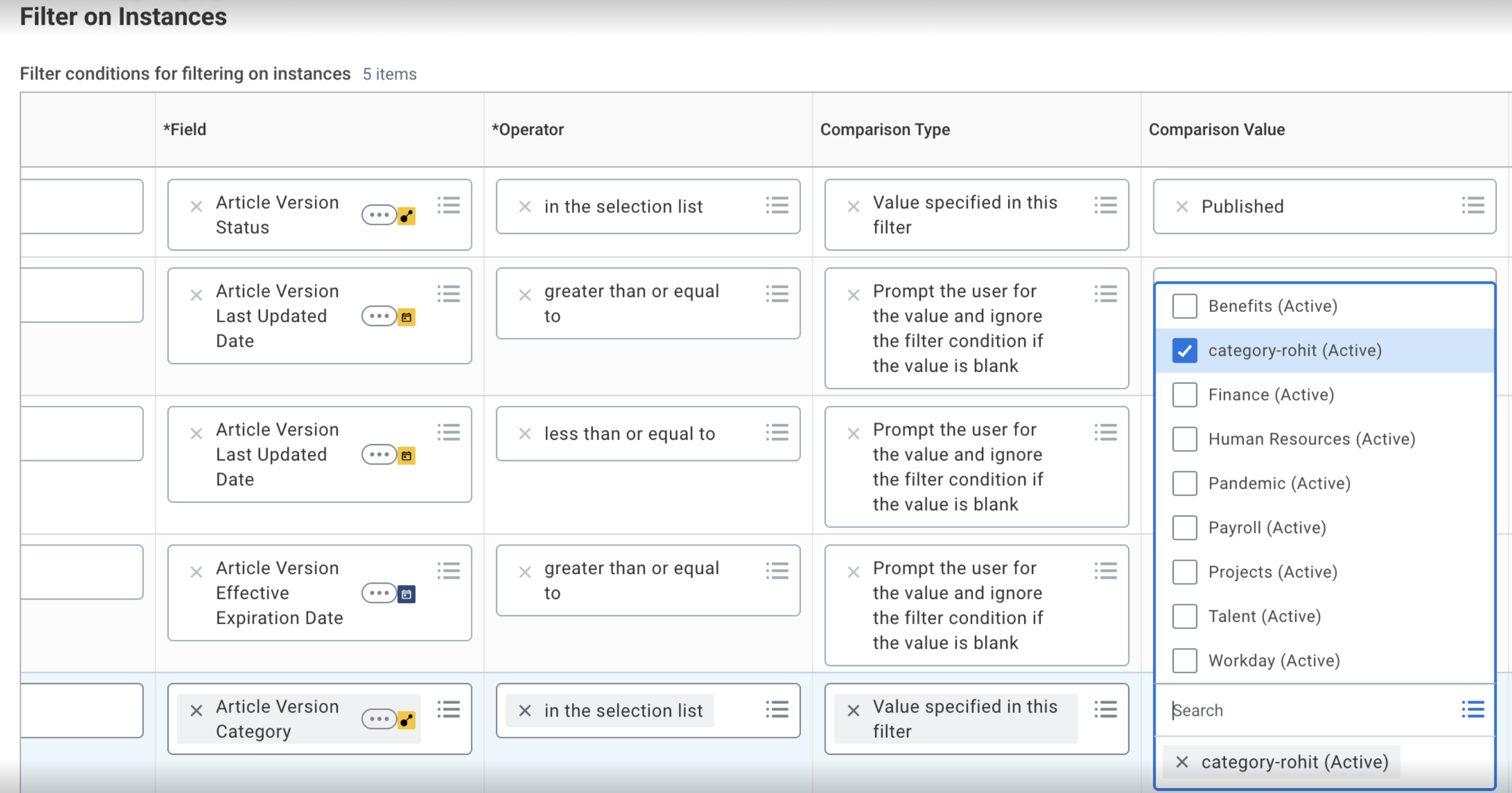 Order Field Operator Value 1 Primary Work Location → Country equal to India 2 Job Family equal to Engineering 3 Hire Date greater than or equal to 01/01/2023 4 Active Status equal to Yes - Set the And/Or connector to AND between all rules
