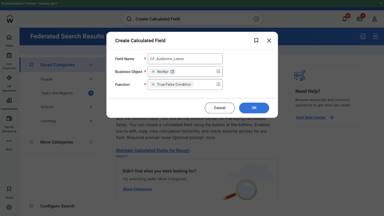 Report 3.2: Custom Audience ReportPhase 1: Build Individual Audience Calculated FieldsStep 1.1 — Navigate to Calculated Field Creation- In the Workday search bar, type Create Calculated Field and select the task