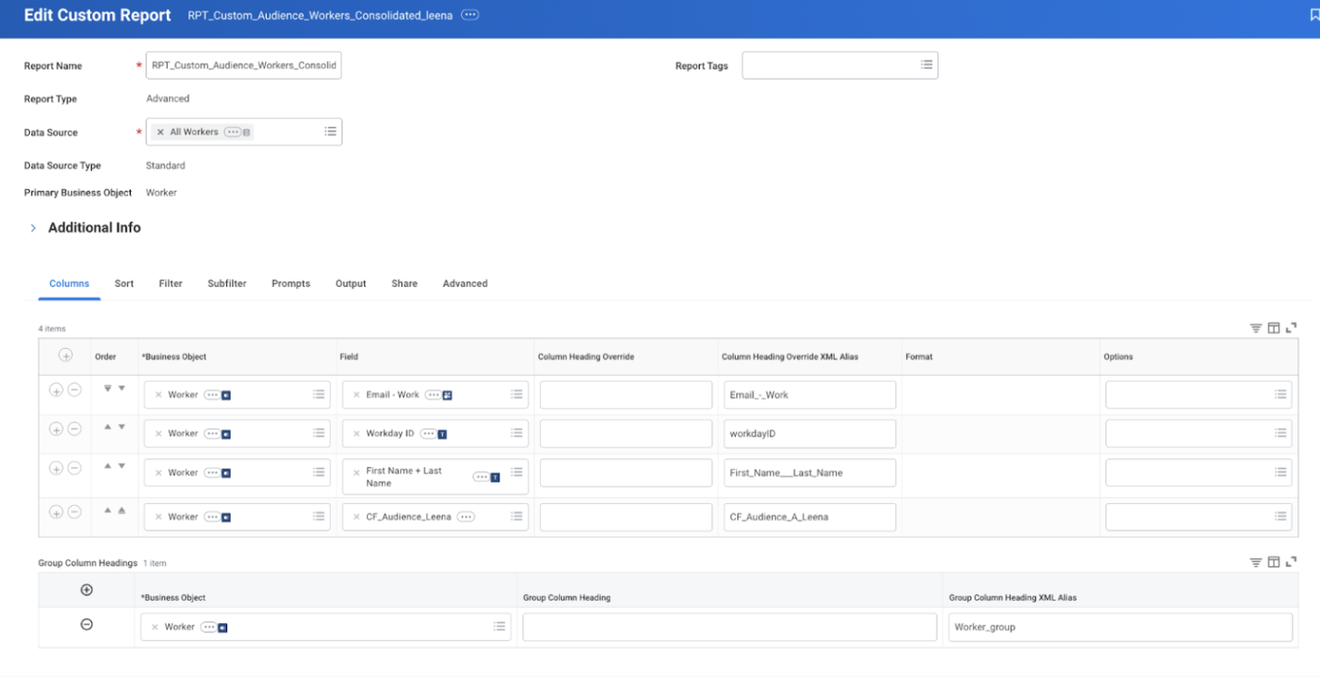 Group Column Headings: Set Business Object: Worker | XML Alias: Worker_group