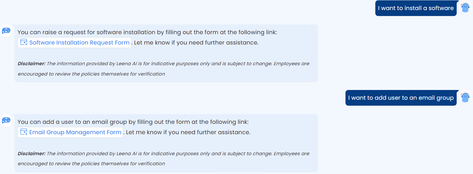 For the transactions enabled by the client admin for Leena AI, users can simply type the query in the virtual assistant to initiate the transaction.