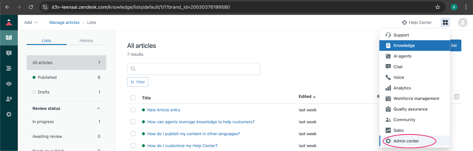 Navigate to Zendesk Admin Center: Log in to your Zendesk account and access the Admin Center.