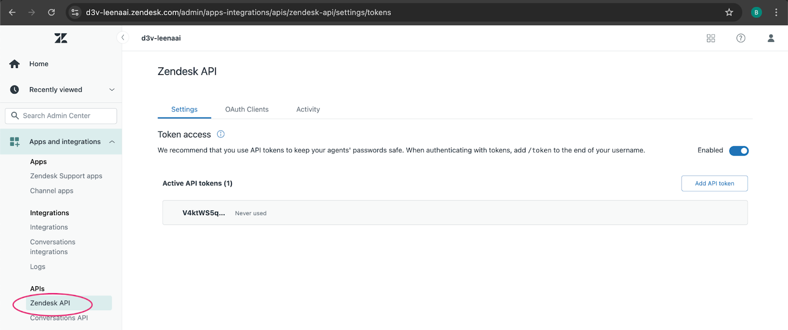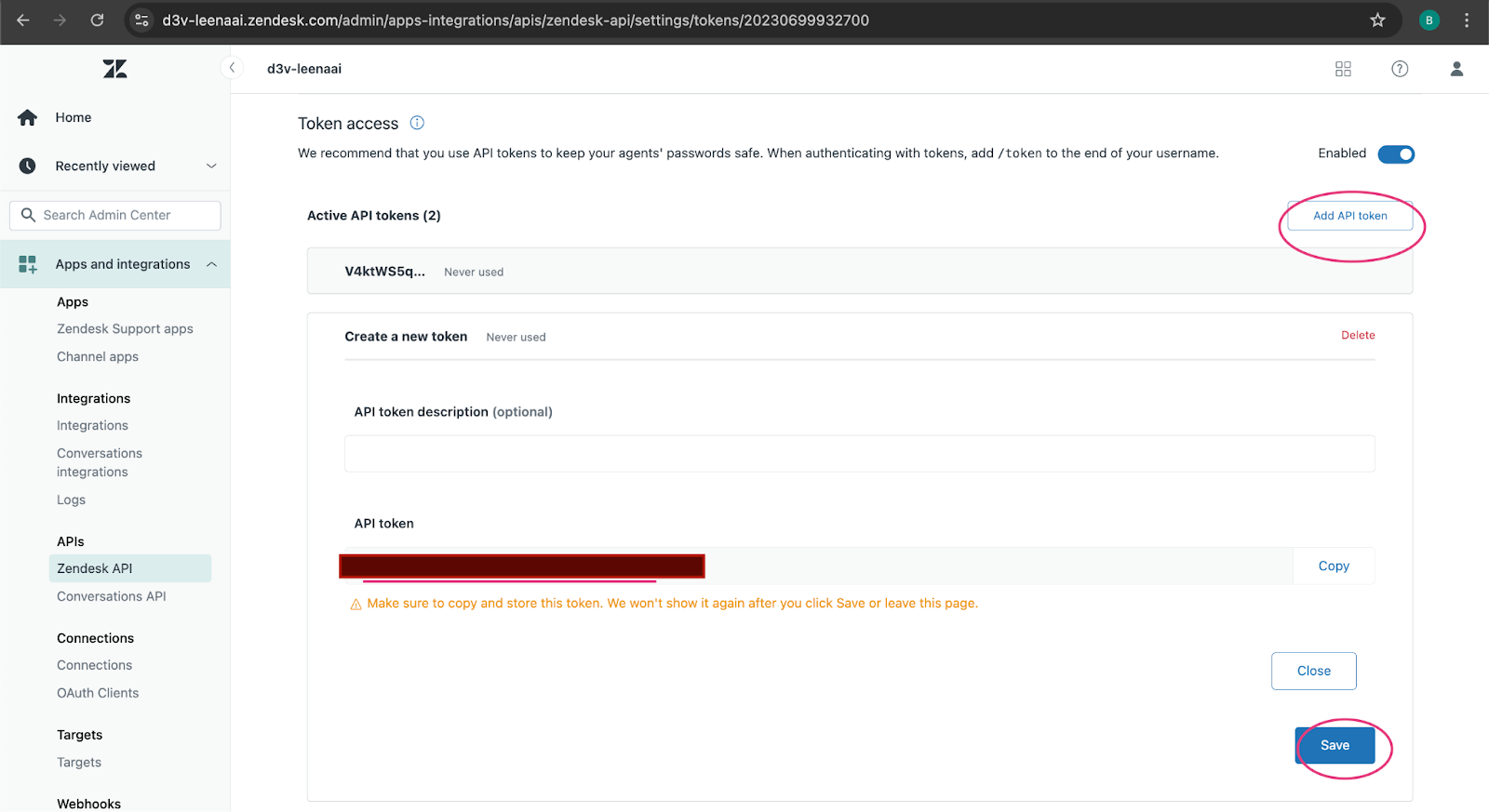 Important: Copy the generated API token immediately and store it in a secure location. Zendesk will only show you the token once.