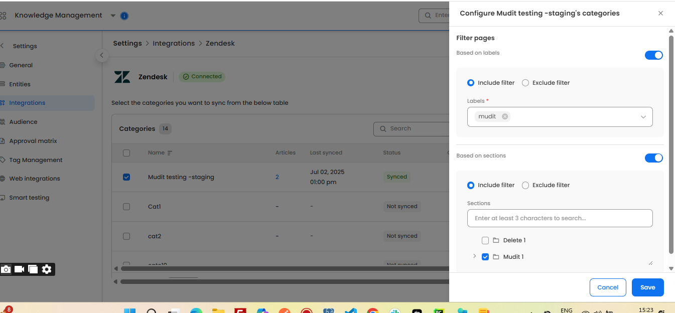 Once Zendesk is successfully connected to Leena KM, a sync operation can be triggered. One can choose to sync chosen categories based on the metadata of 'labels' and 'sections'.